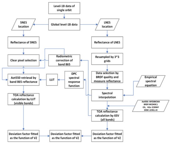 where is the measured radiance with the unit of ; is the calibration coefficient of each channel (band) with the number k and is the equalization factor relative to a specific detector, which can be considered a factor describing the relative changes in calibration coefficients with various row numbers i and column numbers j of the detectors. After launch, both and need to be monitored during the lifetime in space of the sensors. Based on this equation, our calibration method is designed as follows and the flow chart is shown in Figure 2.