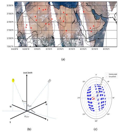LNES calibration sites are located mainly in North Africa, particularly in Arabia, Libya, and Algerie et al., considered radiometrically stable and bright. These sites have been used for POLDER in-flight multi-angle calibration by the cross-calibration method [,,]. Other sensors also use this technique to perform radiometric validation [] or to monitor sensor degradation []. Recently, Zhou et al. [] analyzed the moderate-resolution imaging spectroradiometer (MODIS) bidirectional reflectance distribution function (BRDF) product in desert sites and forests and established BRDF look-up tables (LUTs) for cross-calibration. The feasibility and accuracy of the radiometric calibration of an LNES site using the BRDF products of MODIS have been verified.