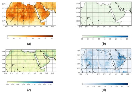 The weighting functions for the BRDF parameters and aot550 of the MODIS (Band 1) product. (a) Par1: The weight coefficient for a Lambertian kernel. (b) Par2: The weight coefficient for a Ross-Thick kernel. (c) Par3: The weight coefficient for a Li-Spare kernel. (d) aot550.