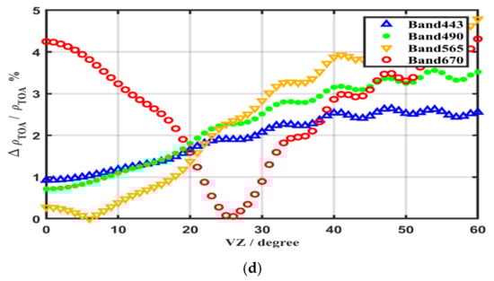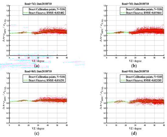 where and represent the directional reflectance as an unknown function of the view zenith angle measured by the DPC in flight and calculated by Py6S, respectively. After considering that the calculation error of the 6SV will increase for a larger view zenith angle, we selected the data of the view zenith angle threshold of 60°, and we neglected the sample for which the BRDF quality factor is not equal to zero (which means very good quality). The aerosol depth (aot550) from the MYD09CMA products is plotted in Figure 4d. The total amounts of ozone and water of the atmosphere come from the ECMWF (https://cds.climate.copernicus.eu/). The deviation versus view zenith angle at the NIR (763–910) bands are plotted in Figure 5a–d. The curves plotted in green are the fit results obtained using the smoothing spline method in MATLAB 2018, and the factor can be used to evaluate the radiometric uniformity of the sensor, where is the deviation factor calculated by the fitted function at the specific view zenith angle .