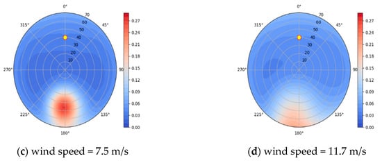 Figure 6 shows the BRDF distribution at the TOA over the clean ocean. The simulation values were set as follows: aot550 = 0.1, pigment concentration = 0.07 mg/m3, solar view zenith = 40° and salinity = 37 ppt; the aerosol type was set to maritime; the wind direction was set to 90°. Through the BRDF under different wind speeds, it was clearly revealed that when the wind speed is low, the scope of the specular reflection area is smaller, and the energy is higher. When the wind speed is high, the energy of the mirror reflection area is weakened, and the scope is enlarged. This characteristic is related to the probability distribution characteristic of the specular reflection on rough surfaces, which is explained in more detail in other research []. In our work, we set other parameters as follows: ozone = 0.25 cm-atm; water content = 2.5 ; aot = 0, 0.01, 0.05, 0.1, 0.15 and 0.2; wind speed = 1, 1.9, 3.2, 4.2, 6.7, 7.5 and 11.7 m/s; and maritime aerosol type. Therefore, there were 42 LUTs in total. The angle of each LUT was set as follows: solar zenith angle, 0–70°, with an interval of 5°; observation zenith angle, 0–70°, with an interval of 3.5°; relative azimuth angle, 0–180°, with an interval of 5°. Thus, each LUT had three dimensional arrays of six bands, and each array had 13 × 21 × 37 elements. We first used wind speed values from the ECMWF to choose the LUTs at the closed wind speed condition, then retrieved the aot550 by the measured reflectance of the 865 nm band and used the aot550 to calculate the apparent reflectance of visible bands. The calculation results are shown in Figure 7a–d, where the results are compared with the desert calibration results.