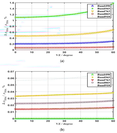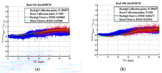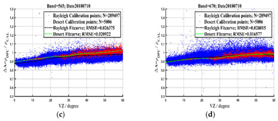 Figure 7 shows that the radiometric deviation calculated by using desert and ocean sites shows significant non-uniformity varying with the view zenith angle. We used two fit curves for each visible band over the LNES and SENS to determine the deviation ratio at view zenith angles of 0°, 15°, 30°, 45° and 60°, and the results are listed in Table 4. For band 670, ∆A = 0.9 for the central field (VZ = 0°), and ∆A = 0.97 for the edge (VZ = 60°), which indicates a nearly 8% relative radiometric deviation on the sensor. For bands 443, 490 and 565, the differences in ∆A from the central field to the edge are larger: about 9–16% for band 443, 11 to 17% for band 490 and 13–16% for band 565. The calibration results based on ocean and desert sites show similar distribution characteristics for ∆A and versus the view zenith angle. However, there are some deviations between the fit curves of these two calibration results, especially at view zenith angles larger than 45° for the blue band to the yellow band (443, 490, 565), which may be introduced in the spectral interpolation of the desert data as the spectra increase quickly with the wavelength in the region of 400–600 nm, which can be found in the other articles [,,]. We finally recommend following the calibration results over an SNES in visible bands.