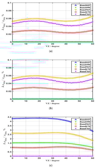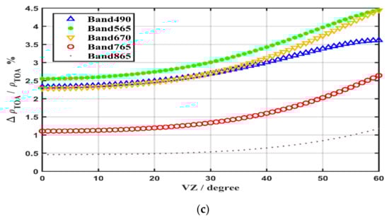 The TOA reflectance error varies with view zenith angle caused by uncertainty of the input parameter over an LNES. (a) The error caused by total amount of ozone uncertainty. (b) The error caused by total amount of water uncertainty. (c) The error caused by aot550 uncertainty.