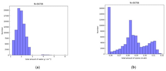 The calibration results over these two kinds of sites for band 670 are in good agreement at view zenith angles smaller than 60°. In addition, the calibration sample number of the land is much smaller than that of the ocean scene. The coverage of the data within the view zenith angle of 30° of the day is small. To evaluate the calibration error over ocean sites (SNES), we used the ECMWF data and the GIOVANNI monthly average data to statistically evaluate the calibration field environment. The deviation of its statistical value from our simulated value was taken as the calibration source deviation and then transmitted through radiation. The software calculates the error of the calibration radiation calculation. A statistical histogram of the environmental parameters is shown in Figure 9.