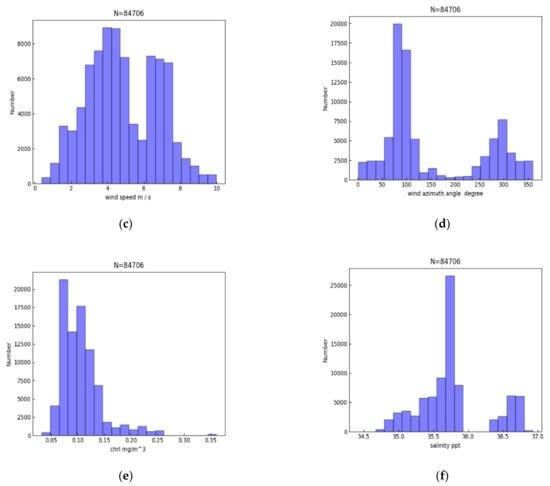 Environmental statistics over an SNES: (a) total amount of water; (b) total amount of ozone; (c) wind speed; (d) wind azimuth angle; (e) chlorophyll concentration; (f) salinity.