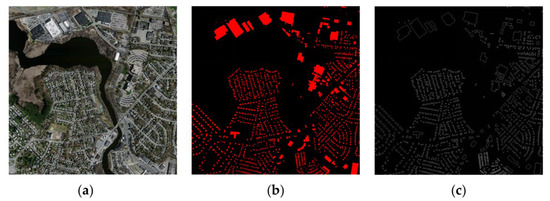 Samples of Massachusetts Building Dataset: (a) original image; (b) original building regions label; (c) building edges label.