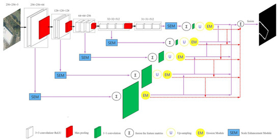 ME-Net is proposed as an end-to-end network that extracts building edge pixels from input high-resolution images. The backbone is VGG16 [48], because the fully connected layers greatly reduced the efficiency of training and the last pooling layer produced a too fuzzy building edge prediction map, so the three fully connected layers and the last pooling layer of VGG16 are removed. The network architecture is illustrated in Figure 4. ME-Net consists of five similar side layers, and each side layer includes several consecutive steps: first, the convolution layer and the maxpooling layer for extracting image features (input: original image; output: image feature map); second, the scale enhancement module (SEM) for extracting multi-scale edge features with the least parameters (input: image feature map; output: building edge feature map); third, the upsampling block for improving the resolution of feature map (input: building edge feature map; output: building edge feature map); last, the erosion module (EM) for crisping the building edge pixels (input: building edge feature map; output: building edge probability map).
