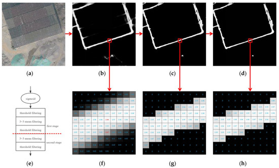 The erosion module (EM) and an example of Jiangbei building edge dataset: (a) original image; (b) the building edge probability map before EM; (c) the output after the first stage of EM; (d) the output after the second stage of EM; (e) the details of EM; (f–h) enlargements of red boxed areas in (b–d).