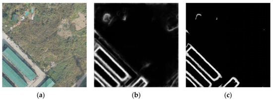 An example of Jiangbei New Area dataset: (a) raw image; (b,c) different building edge probability predictions with the same strict F1-score.