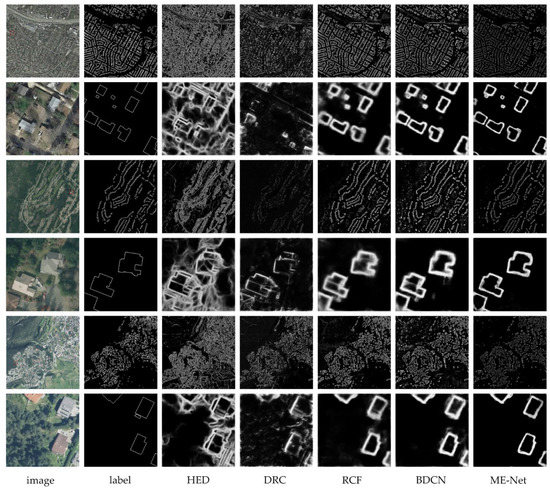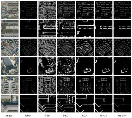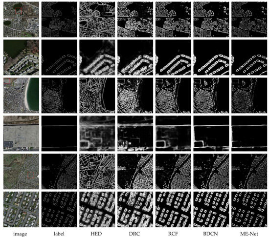 Figure 8 shows three different cases of building edge probability maps in the test dataset. The odd rows are test images and results with size of 1280 × 1280 pixels, and the even rows are patches of 256 × 256 pixels in the selected areas by red boxes. The first case compared the detection of large building edges from a school. HED and DRC could not distinguish the building edge from the noisy edge. BDCN and ME-Net extracted a clearer edge but missed a small part of it. The second case was used to show the edge detection of small and dense residential buildings, compared with other networks, ME-Net had the least false predictions. The last case was an edge detection of large office buildings. RCF and BDCN performed better than HED and RCF with fewer negative roof edges, and only ME-Net could predict all building edges, which almost matches the label. In short, our ME-Net has the best performance with the most regular building edge shape and the crispest edge.