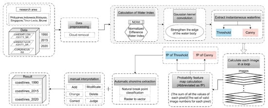 We proposed a unified standard coastline extraction method based on GEE and dense time-series remote sensing image data by calculating the probability of the waterline. This method mainly includes remote sensing image preprocessing, water index calculation, Gaussian kernel convolution, instantaneous waterline extraction, probabilistic feature map calculation, automatic coastline extraction, and manual interpretation. The main idea is to calculate the normalized difference water index (NDWI) of each valid image in a year through Otsu algorithm threshold segmentation and the Canny edge detection operator for edge detection, obtain the instantaneous waterline at all times of the year, calculate the frequency of edge occurrence to obtain a probability feature map, and extract the coastline automatically according to the final probability feature map using the natural discontinuity classification method. Combining the two results and the manual correction extracts the messy part of the data, and then the final shoreline result can be obtained. This method fully takes into account the impact of tidal-level variations, which are important for determining the average coastline from satellite data. The method not only effectively avoided the deviation caused by treating instantaneous waterlines as shorelines, but also did not require the support of many years of tide observation data and got rid of the dependence on average high-tide height data. Even in remote areas with sparsely populated, complex terrain and a harsh environment, an accurate coastline can be extracted, and the method can be widely used in a wide range. The workflow of this research method is shown in Figure 1.