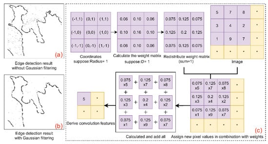 The principle and effect of Gaussian kernel convolution. (a) edge detection result without Gaussian filtering; (b) edge detection result with Gaussian filtering; and (c) Gaussian kernel convolution process.