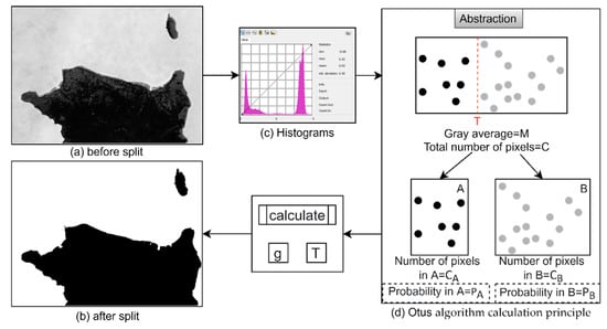 When the value of ‘t’ changes, the ratio of pixels corresponding to the two parts ‘A’ and ‘B’ and the average gray value also change. When ‘g’ reaches the maximum value, the segmentation effect is the best, as shown in Figure 3c; the ‘t’ at this time is marked as ‘T.’ ‘T’ is the best threshold.