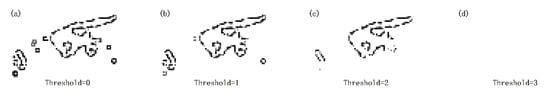 Comparison of different extraction results produced by the canny operator under four different threshold settings. (a) edge extraction results when the threshold is 0; (b) edge extraction results when the threshold is 1; (c) edge extraction results when the threshold is 2; and (d) edge extraction results when the threshold is 3.