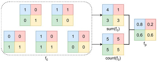 where fP represents the probability, and fc represents each pixel in the image. We used the sum to calculate the sum of all the values of each pixel and used the count to calculate the set of effective image numbers for each pixel. The schematic diagram of the calculation process is shown in Figure 5.