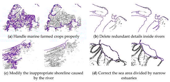Schematic diagram of comparison before and after shoreline processing. (a) before and after handling marine farmed crops properly; (b) before and after deleting redundant details inside rivers; (c) before and after modifying the inappropriate shoreline caused by the river; and (d) before and after correcting the sea area divided by narrow estuaries.