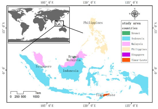 To verify that the application of this method to extract the coastline offered the advantages of the uniform method, high accuracy, and large-scale application, we selected the Malay Islands region, with many islands and a complex coastline structure, as the research area. The research area included six countries: the Philippines, Indonesia, Malaysia, Singapore, East Timor, and Brunei.