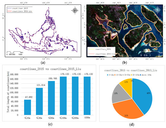 We did a superposition analysis of the "coastlines_2015" data result extracted in this study and "coastlines_2015_Liu." As Figure 8c shows, a total of 67,892 km of coastlines and "coastlines_2015_Liu" data results were within the accuracy range of no more than 10 m. Moreover, 67,892 km represented 40% of all coastline lines (Figure 8d). Additionally, the 150,765 km coastlines were within the accuracy range of no more than 50 m from the 2015 data standard. All the extracted results were within the range of the location deviation of no more than 100 m, and the error of 89% in the results was no more than 50 m. Furthermore, the "Coastlines_2015" data results and "coastlines_2015_Liu" data results were in good agreement. Therefore, from the results of the accuracy assessment, we concluded that the overall accuracy of the coastline extracted by this method had a higher coincidence degree of less than 100 m compared with the widely used data that have been published to date. The accuracy of the results also was good, and thus, these results can be used in the analysis of temporal and spatial changes in the Malay Islands.