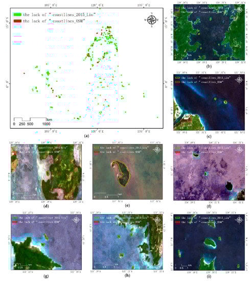 According to the phenomenon of some islands missing “coastlines_2015_Liu” data, and “coastlines_OSM” data not missing, we concluded that data of “coastlines_2015_Liu” could be drawn manually with higher accuracy. The data had a significant shortcoming that is easy to miss compared with automatic extraction. The islands that were extracted by others revealed the shortcomings of the single-scene image extraction coastline. When the sea level rises, the islands and reefs will be submerged, and some new islands and reefs will be exposed when the sea level drops. These uncertain factors can be minimized when extracting the coastline from dense time-series remote sensing images. Of course, some islands and reefs also may be newly formed because the earth has a complicated geographical structure and geological conditions. Every time the qualitative conditions change, some new islands will be formed. For example, changes in plate tectonics, the melting of glaciers, and the eruption of volcanoes may all create new islands. To further verify the real existence of the new islands discovered through data overlay, the corresponding remote sensing images were confirmed one by one. The details of some islands are shown in Figure 9b–i.