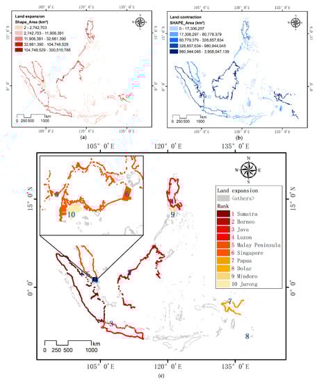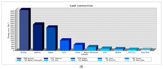 According to the superposition analysis of the land area of the entire study area, it is known that land expansion and land contraction coexist. Generally, the land area showed a shrinking trend. Among these changes, the changes in the Indonesian Islands were the most significant. Whether it was land expansion or contraction, the Indonesian Islands showed a more obvious trend of change than did the Philippine Islands. As shown in the red area in Figure 10a,b, the large islands in Indonesia expanded and contracted to a certain extent. Among these changes, the changes in Borneo were more obvious. In addition, Luzon and Palawan in the Philippines also showed significant expansion and contraction. Compared with the islands in the southeast of the Philippines and the Sulawesi and surrounding small islands, these changes were minimal. This conclusion was the same as the research results in []. As shown in Figure 10a, Indonesia Island, North Borneo, Palawan, and Luzon on the west side showed an expansion trend, and they were all close to the Eurasian continent. We inferred that the main reason for this phenomenon may be that the Philippines, Indonesia, and Brunei are all major import and export countries. The development of foreign trade has increased the demand for port construction, and the economic development brought about by trade has indirectly led to population migration. This increase in population has increased the demand for land area. Therefore, human activities, such as land reclamation, coastal aquaculture, and port construction, have had a greater impact on the coastline. Compared with the obvious expansion trend of North Borneo, almost no land expansion phenomenon was evident in South Borneo. However, we did observe a certain contraction trend. Combined with the changing trend of Sulawesi, we inferred that Sulawesi in Indonesia is the center, and the surrounding islands include Taliabu, Bulu, Bazan, Weta, and Yan. Many islands, such as Denali and South Borneo, have been eroded by seawater. Thus, to a certain extent, we identified a phenomenon of reduced island area. The specific changes are shown in Figure 10b.