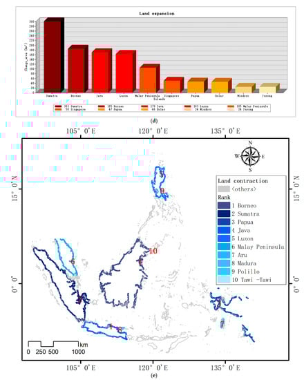 Using natural islands as a benchmark, the statistical results are shown in Figure 10c,e. The top 10 regions with the most obvious expansion were Sumatra, Borneo, Java, Luzon, the Malay Peninsula, Singapore, Papua, Dolac, Mindoro, and Jurong. The top 10 regions with more obvious contraction were Borneo, Sumatra, Papua, Java, Luzon, Malay Peninsula, Aru, Madura, Polillo, and Tawi-Tawi. The specific change area is shown in Figure 10d,f. Among them, Sumatra is a well-known volcanic island. It is located in the Eurasian seismic zone and belongs to the high-earthquake area. Earthquakes occurred in many recent years, such as 2004, 2009, 2010, and 2012, and were accompanied by relatively strong tsunamis. Even the highest tsunami reached 10 m, which greatly damaged the environment of the coastal area, and the post-disaster restoration also had an impact on the coastline. The central part of Borneo has many mountains and high altitudes. Its topographical factors give it an extremely uneven population distribution. Because the coastal areas have the advantages of convenient transportation and suitable temperature, the population is mainly concentrated in the coastal areas, and human activities have significantly affected the distribution of the coastline of Borneo. According to these findings, human activities have produced larger impact on coastal areas. Compared with the obvious changes in local areas brought about by human activities, the changes in the position and shape of the coastline caused by natural forces are often large and small.
