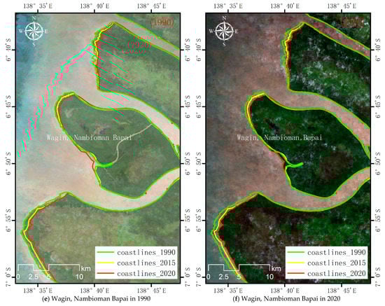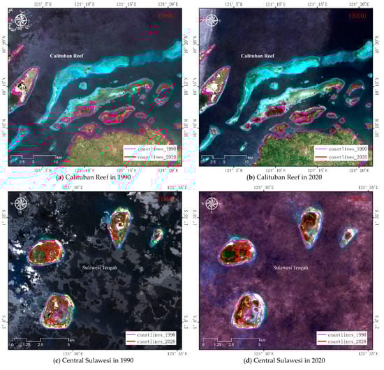 Under the influence of natural factors, the area of Calituban Reef in the Philippines increased over the study period; in contrast, the islands of Central Sulawesi and Papua in Indonesia were eroded by seawater. Figure 11a,b shows the Calituban Reef, with the Olango on the left, which belongs to the province of Cebu in the Philippines. This area has a hot and humid climate []. Comparing the extraction results in 1990 and 2020, the area of some islands and reefs in the Calituban Reef increased, and new smaller islands and reefs surfaced. This area has little human activity, but it has one of the most productive ecosystems on the planet, namely coral reef resources []. Comparing the coastlines of different periods, we found that the island group on the east side of Central Sulawesi in Indonesia was severely eroded by seawater, from a relatively complete and round landmass 30 years ago to a less regular shape. This complex structure is shown in Figure 11c,d. In 2018, Indonesia in Sulawesi Province Dongala county had an earthquake with an intensity of 7.4, which was accompanied by a tsunami. Road traffic, water, the electricity system, and communication engineering were nearly shut down in many areas. It lost contact with the outside world, which made it become an "isolated earthquake island" []. The impact of the earthquake and tsunami was huge and is a possible reason for the changing shape of the island. In addition, the coastline of Nambioman Bapai in Indonesia [] was also severely eroded, showing a serious coastline retreat trend (Figure 11e,f). The "coastline" in this case is not really a coastline, but may be the observation line of the submerged mangrove forest. From 1995 to 2015, the mangrove line receded, and the mean and high waterlines probably receded by the same amount. This observation needs to be verified by additional investigations.