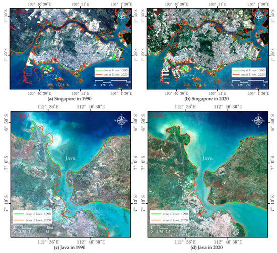 Through the comparison of the data of the three phases, we found that the reclamation phenomenon in the islands of Java, Singapore, and Semirara was more significant. As early as 1991, Glaser et al. [] proposed that Singapore’s land reclamation was as high as 10% of its land area at that time. As shown in Figure 12a,b, in the past 30 years, Singapore’s reclamation has been particularly obvious, especially on Jurong, which is the center of Singapore’s oil refining. As an artificial island, the area of Jurong increased by nearly 24 km2 from 1990 to 2020, and Singapore’s Changi and Queenstown areas had an obvious expansion. This phenomenon also can be seen in the Semirara in the Philippines (Figure 12e,f). In the Semirara, geographical topography is mostly hilly, with heavy rainfall and high temperature. Its economic construction is mainly based on the coconut industry, coal industry, and fishery. In recent years, fishery has developed and become prosperous. Fishery cultivation in this area is likely to increase the demand for island areas, which may cause it to expand the island Java is the island where Indonesia’s capital Jakarta is located. It is an important population settlement. Whether it is in the political or economic fields, it has a leading position in the country. As shown in Figure 11c,d, the eastern land area of Java has a clear trend of reclaiming land from the sea, and the phenomenon of artificial transformation is obvious.