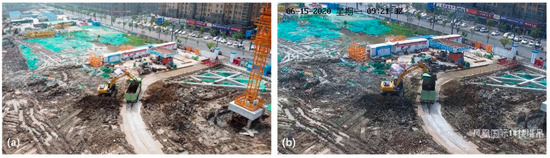 Screenshots of (a) the UAV video and (b) the surveillance video collected from an actual earthwork site. The two Chinese characters in the second photo indicate the video recording time (in the upper left corner of the picture: 15 May 2020, Monday 09:21:32) and the surveillance camera ID (in the lower right corner of the picture: the tower of Phoenix International Building #1).