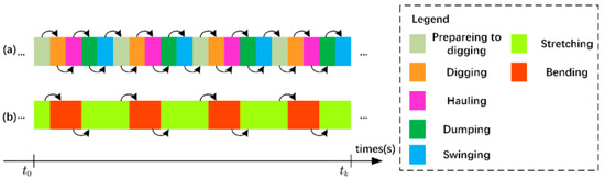 Atomic actions of an earthmoving excavator intercepted in a video sequence: (a) five-atomic-action sequential pattern and (b) stretching-bending sequential pattern.