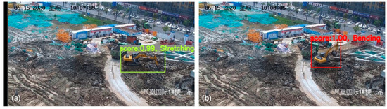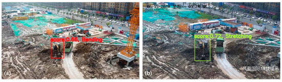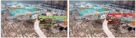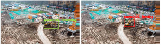 Self-occlusion of the earthmoving excavator is the main cause of atomic action recognition errors [3,4]. There are two reasons for self-occlusion. Firstly, there is self-occlusion of the arm of the earthmoving excavator following the rotation of the body to a certain angle. In other words, it occurs when the arm rotates to a certain angle with the body, at which time the arm points roughly in the direction of the principal point. Another reason is UAV shaking. For example, when the UAV swings to a certain position when the arm of the earthmoving excavator happens to point in the direction of the principal point, self-occlusion will occur. It is difficult to distinguish the atomic actions of earthmoving excavators using visual appearance alone when there is self-occlusion. Examples of partial self-occlusion and recognition errors that appear in the validation video used in this study are shown in Figure 7. The atomic action shown in Figure 7a is actually “Stretching”, but the SSD model incorrectly recognized it as “Bending”. The atomic action shown in Figure 7b is actually “Bending”, but the SSD model incorrectly recognized it as “Stretching”.