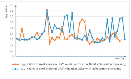 The value reflects the association between the “Stretching” and “Bending” atomic actions when recognizing a work cycle. If there is undesired motion in the video data acquired by UAV remote sensing due to UAV shaking, this leads to changes in values. Therefore, the impact of UAV shaking on the recognition performance of the UAV-SBSP can also be reflected by the variation in values. The blue curve in Figure 8 shows the distribution of values for all recognized work cycles in the UAV validation video when stabilization processing was used. The tan curve shows the distribution of values for all recognized work cycles in the UAV validation video when stabilization processing was not used. We used the blue curve as a baseline and compared the tan curve to it to evaluate the impact of UAV shaking on the variation of the values. Most values on the tan curve in the figure have a large variation and deviate from the baseline curve. This deviation reflects the magnitude of the UAV shaking. For example, there are some points on the tan curve that deviate from the blue curve, and it can be presumed that the magnitude of UAV shaking was larger at this time. When the magnitude of UAV shaking increases further, there will also be values of less than zero, which can lead to work cycle misdetection. This is one of the reasons why the UAV-SBSP misses more work cycles in the UAV validation video without stabilization than in the UAV validation video with stabilization.