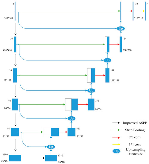 The improved U-Net model proposed in this paper used Efficientnet [31] as the feature extraction network in the encoder part. Efficientnet has better accuracy and a faster speed than traditional networks such as ResNet [32], DenseNet [33], and Xception [34]. An improved ASPP structure was used between the encoder and the decoder. The decoder part restored the feature map size through the proposed up-sampling structure, which was composed of a flow alignment module and an ECA (Efficient Channel Attention) module [35]. Additionally, the encoder and decoder parts of the same level were connected through skip connection, which contained an attention module composed of strip pooling [36]. The overall structure of the improved U-Net model is shown in Figure 2.