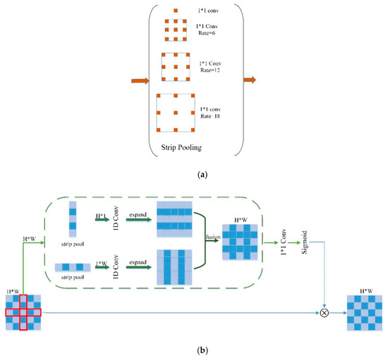 In order to obtain contextual information more effectively and make it more suitable for extraction tasks in offshore aquaculture areas, the traditional ASPP structure was improved. The improved ASPP structure proposed in this paper, as shown in Figure 3a, mainly uses strip pooling instead of traditional spatial pooling. As the sampling window of the traditional spatial pool is square, when the target object is a long strip, such as an offshore aquaculture area, the square window will inevitably contain interference information from other unrelated areas, while for the strip pool, long strip sampling windows, sampling reduces the acquisition of irrelevant information, and reduces the interference of the above problems to a certain extent [36]. The improved ASPP structure is shown in Figure 3b.