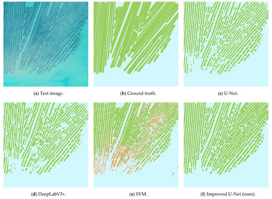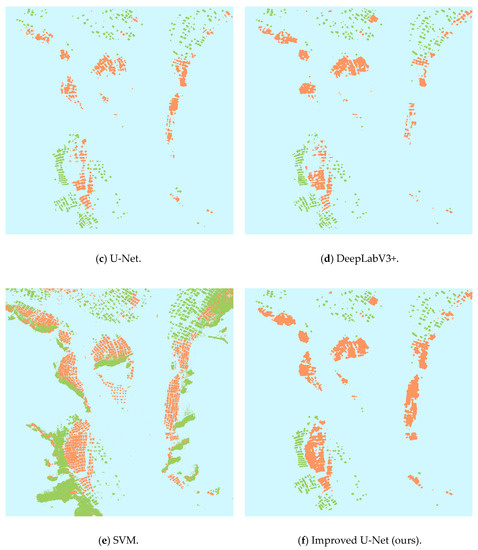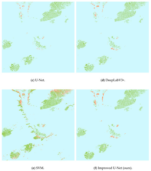 First, we analyzed the classification results of each model on the test set from a qualitative perspective, as shown in Figure 5. From the classification results, it can be seen that the classification results based on the traditional machine learning algorithm SVM were significantly worse than the classification results based on several other deep learning methods. A lot of background information was mistakenly divided into floating raft aquaculture and cage aquaculture areas. Compared with the traditional machine learning algorithm SVM, the classification results of the original U-Net model and DeepLabV3+ model significantly reduced the misclassification of floating raft aquaculture area and cage aquaculture area, but there were still some obvious problems of missing points in the cage aquaculture area. The improved U-Net model proposed in this paper can better obtain context information and multi-scale information, and the classification results were significantly better than the machine learning algorithm SVM, the original U-Net model, and the DeepLabV3+ model. The floating raft aquaculture and cage aquaculture areas were almost recognized.