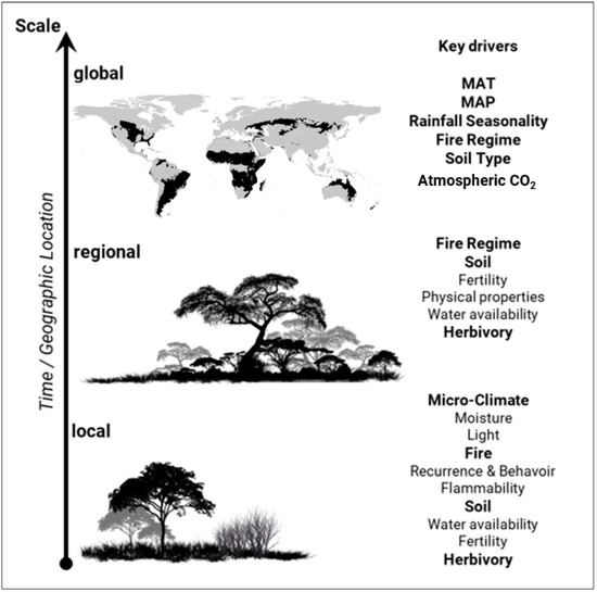 Earth Observation (EO) information provide a suitable tool for the monitoring of savanna ecosystems [11,12,13,14]. However, due to the nature of savanna, it is one of the challenging biome to monitor using EO data [11,15], particularly because of the difficulty to distinguish between woody and herbaceous components. The savanna landscape is shaped by complex interactions of top-down and bottom-up processes, resulting in heterogenous woody and herbaceous layers with plant density, height, and canopy cover varying over space and time [1,2,15]. Rainfall, fires, herbivory, and human activities are major drivers of the complex savanna landscape [1,2,16]. At a global level (Figure 1), savannas are reported to be influenced by climate, specifically mean annual temperature (MAT), mean annual precipitation (MAP), rainfall seasonality, fire regime and soil type [2,17], and atmospheric CO2 levels [18,19,20]. At a local level, fire regime, such as fire reoccurrence, fire behavior, soil properties, such as fertility, water availability, herbivory, and micro-climate factors, play a major role in influencing savanna cover types (Figure 1) [1,2,17,21,22]. Fire and herbivory and their interaction serve as disturbance mechanisms that affect the structure of the savanna and result in a variable and dynamic mixture of tree, shrubs, and grasses [16,22,23,24].