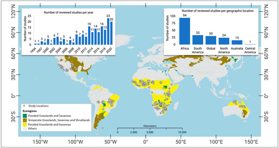 The geographic locations of the reviewed publications study areas are depicted in Figure 3. About 47% of the papers have a study area located in Africa, followed by South America with 18%. This is possibly because more than 50% of Africa is covered by savanna, concentrated in different parts of the continent and made up of varying savanna ecosystems.