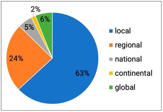The vast majority of the studies (~63%) were conducted at a local scale (Figure 4). Approximately 24% of the reviewed publications were conducted at a regional scale.