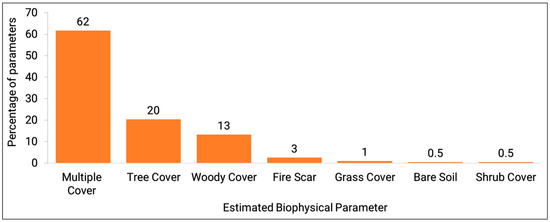 The majority of the reviewed studies (62%) estimated multiple fractional covers when analyzing mixed pixels (Figure 5). Multiple cover estimation means that the authors did not just focus on estimating one type of cover but estimated multiple fractional covers, such as grass, trees, shrubs, and bare ground, or various combinations of these. Theseira et al. [107] estimated multiple fractional covers by applying a spectral mixture model to derive grassland, areas of low and high savanna trees, grassland, savanna shrub, and bare ground; Xian et al. [108] used non-parametric regression trees to characterize a shrubland environment into continuous fields of herbaceous, litter, shrub, and bare ground; and Bauman et al. mapped continuous fields of tree and shrub cover in the Gran Chaco savanna ecosystem in South America [109]. Trees were the most estimated single fractional cover. Approximately 20% of the reviewed studies estimated tree cover (Figure 5). Hansen et al. [60,61] estimated global tree VCF. It is possible that there can be overlap between tree cover and woody cover, since woody cover may include trees and shrubs. This is further confounded by tree cover and woody cover often being used as interchangeable terms, as well as the differences between studies in defining the difference between a tree and a shrub (e.g., criteria of height and multi-stemming). Roughly 13% of the reviewed papers estimated woody fractional vegetation cover, which typically includes both tree and shrub cover (Figure 5). Many studies estimated woody cover in African savannas [84,110]. For example, Higginbottom et al. [111] and Naidoo et al. [83] used a fusion of optical data with SAR to estimate fractional woody cover in African savanna. In other regions, Yang and Crew [48] used Landsat data to estimate woody cover in the Texas savannas in North America.