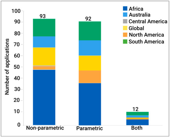 From a geographic perspective (Figure 8), non-parametric methods have the highest percentage of application in Africa, with more than 50% of the studies having used non-parametric methods located in Africa. When it comes to Australia, studies conducted in Australia have a slightly higher preference of parametric methods of ca. 11% use compared to ~2.5% application of non-parametric methods there. Due to Africa having a range of savanna ecosystems with high cover variability due to variable fire regimes and land uses (e.g., livestock grazing and wildlife conservation), the high variability in cover may prompt researchers to opt for methods which are capable of dealing with high spatial heterogeneity in land cover [15].