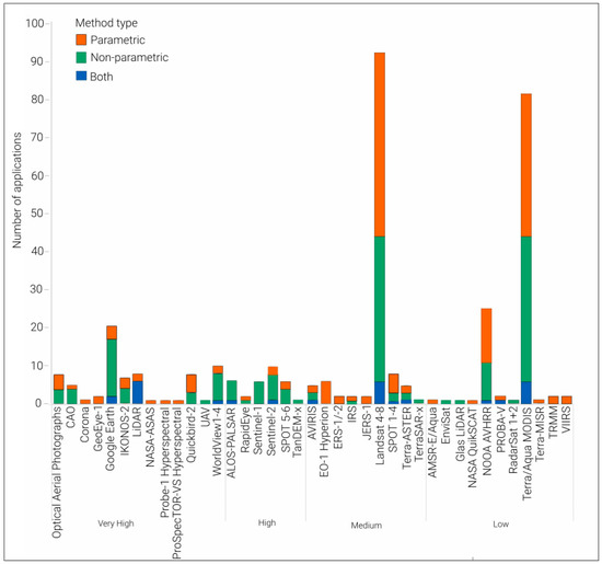 When we observed the type of methods from VHR to low spatial resolution in Figure 9, we found non-parametric methods to be the most frequently applied to VHR and HR EO systems with 60% and 77%, respectively. Contrary to that, parametric method were the most frequently used methods for medium and low resolution EO data with 55% and 51% application there, respectively. Generally, we found that, for EO sensors falling in the categories of VHR and HR, approximately more than half 11 (57%) of them have more than 50% of non-parametric methods application. Apart from MODIS, sensors of medium and low resolution tend to have employed parametric methods more frequently.