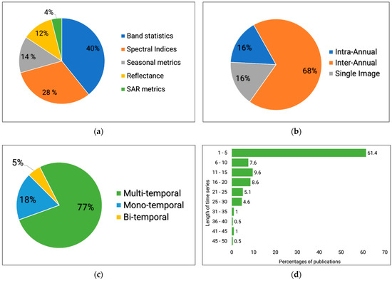 The majority of the studies used inter-annual (68%) temporal data, which means the time series enabled the modeling of inter-annual differences of multiple years (Figure 10b). The majority of the temporal EO data used in the mixed pixel analysis are multi-temporal time series (77%) (Figure 10c). A larger part of the studies applied shorter time series (~61.4%) EO data with a length of 1–5 years in (Figure 10d).