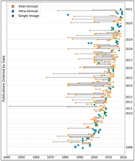 The length of analysis in years for the reviewed publications. Studies’ length of investigation is shown on x-axis with the publication year shown for every publication on y-axis. Inter-annual studies which represent investigating periods covering multiple years are illustrated by a line with orange square at the ends, while multiple images spanning over a single year (intra-annual) are represented by blue diamond shape point, and single images which represent a mono-temporal single date are indicated by single round green point symbol. The graph was generated with courtesy of a Python code generated by Sophie Reinnerman of German Aerospace Center (DLR).