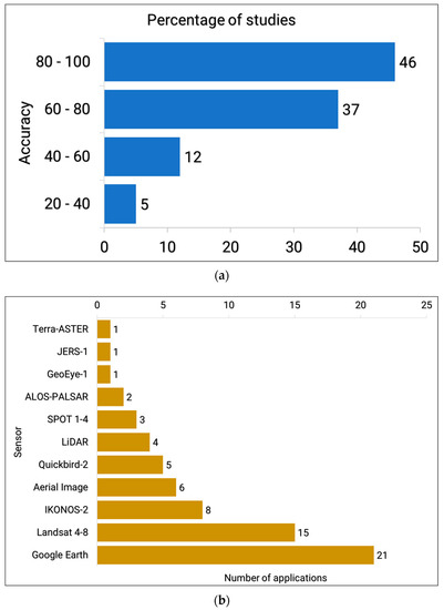 The percentage of studies per overall accuracy class (a) is shown only for those publications with overall accuracy clearly indicated, and (b) remote sensing data used in the validation process for those studies that reported an accuracy are shown.