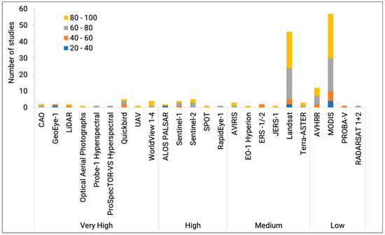 In order to find out which EO datasets achieved a better accuracy, a comparison is made between the four accuracy categories (Figure 13) across the spatial resolutions (very high, high, medium, and low) of those EO datasets utilized by the studies. The EO dataset types which have the highest percentage of studies achieving a >60% accuracies are those which have used medium spatial resolution (88%), followed by 84% of studies which have used the HR spatial resolution EO data. Studies which used VHR EO data have the lowest (74%) number of studies, which achieved accuracies of >60%, followed by those studies which have used low spatial resolution EO data (82%). The majority of studies have used low spatial resolution compared to others, with HR EO datasets being the least used across those studies which reported an overall accuracy. Although less frequently used, HR studies achieved better accuracies compared to VHR and low resolution. Medium resolution studies which have the highest percentages of studies (88%), with high accuracies (>60%), is the second most used type of EO datasets across the 159 studies that have reported an overall accuracy and the most used EO data type among all the 197 reviewed studies.