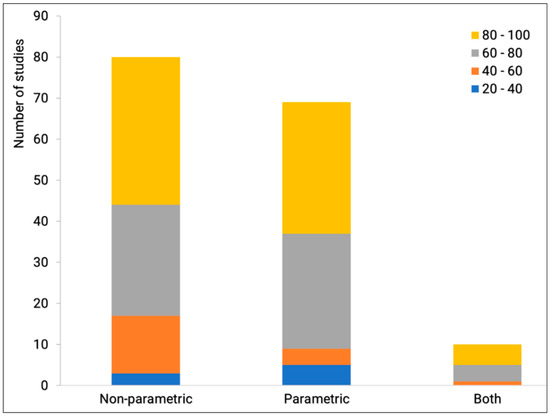 In Figure 7, the literature review shows the percentage of applications for each method categorization. The review shows that 93 (~47%) of the reviewed publications used non-parametric methods, while 92 (~47%) used parametric methods, and only 12 (~6%) used a combination of parametric and non-parametric methods.