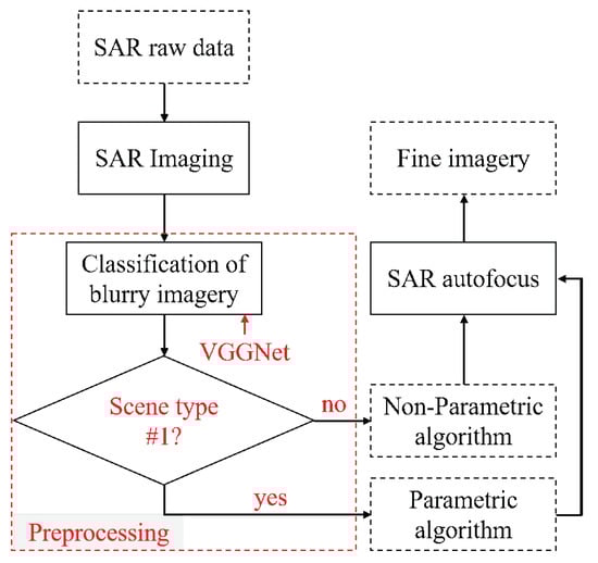 From the perspectives of autofocus accuracy, first, and efficiency, second, when the scene contains many dominant points, we should choose the non-parametric method to achieve autofocus processing to improve efficiency. On the contrary, we should choose the parametric one to ensure accuracy. However, in actual data processing, we usually do not know whether many dominant point targets are present in the scene in advance so we cannot determine which autofocus algorithm should be chosen. To solve this problem, this paper proposes an airborne SAR autofocus approach combined with blurry imagery classification. Blurry imagery classification based on a typical VGGNet [] is embedded into the traditional autofocus framework as a preprocessing step before autofocus processing. By using this preprocessing step, the type of scene can be automatically determined before autofocus processing. If no dominant point targets are present in the scene, it is regarded as the first kind of scene and the parametric method is used for autofocus processing. Otherwise, it is regarded as the second kind of scene, and the non-parametric one is adopted.