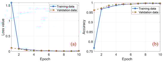 Loss function (a) and accuracy (b) of the training and validation data varying with the epoch.