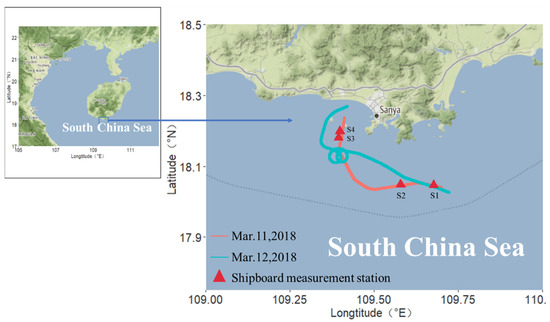 The data used in this paper were obtained from the observation experiment of subsurface plankton layer by airborne lidar in Sanya Bay, South China Sea (SCS). The airborne lidar (SIOM) comprised a frequency-doubled Nd:YAG laser and was operated at 532 nm with pulse duration of 1.5 ns and pulse repetition rate (PRF) of 1 kHz. The telescope diameter was 200 mm and field of view (FOV) was 40 mrad [24]. Two flight measurements were conducted in 11 March and 12 March 2018 in Sanya Bay, respectively. Simultaneously, an underwater hyperspectral absorption and attenuation meter (AC-S) and profile Chlorophyll-a fluorescent probe were used for shipboard in situ measurements. There are a total of four measurement stations, and the Chlorophyll-a concentration, absorption, and attenuation coefficient were measured. Figure 1 shows the flight tracks of airborne lidar and location of shipboard synchronous measurement stations.