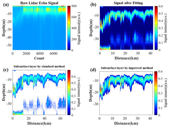Figure 4 shows a vertical slice of the subsurface phytoplankton layer signal detection results measured by airborne lidar on 12 March 2018 through a step by step process. From Figure 4a, some strong signals caused by the high reflection of the sea surface can be seen near the surface, and these sea surface reflection signals are invalid. Therefore, the upper limit of effective range of regression depth is 2 m below the sea surface. The original signal consists of five discontinuous signal segments; the first segment of the signal starts at 20 m underwater and then rises to about 10 m. The remaining four segments of signals are located at 5–10 m, and the intensity is stronger than the first segment of the signal. The fitting method is used to calculate SB, and the result is shown in Figure 4b. After subtracting SB from the original signal by Equation (4), a continuous banded subsurface signal is obtained; the layer raised from 20 m to 10 m and remained at 10 m without significant depth change after 10 km. At the depth under 30 m, 0 to 10 km, there is a segment of strong signal followed by several weak signals. These signals may come from other creatures or seabed. If these noise signals are not removed, the calculation of SCML will be affected which will affect the calculation of depth and thickness of subsurface phytoplankton layer. Figure 4c shows the subsurface layer filtered by the standard method. Although the subsurface layer was extracted, the noise signal also remained. Figure 4d shows the schematic diagram of the subsurface phytoplankton layer detected according to Equations (5)–(8). In Figure 4d, the signal below 30 m is filtered and subsurface layer is extracted. The depth of subsurface layer changed significantly, rising from 20 m to 10 m. The layer located between the depth from 7.8 m to 12.9 m. had an average maximum depth of 10.11 m and a layer thickness of 5.2 m.