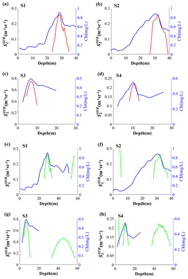 Comparision between subsurface phytoplankton layer detection result of IASPLDM and unimproved method based on lidar data and shipborne in situ measurement. (a–d) are the result of IASPLDM and correspond to shipboard synchronous measurement stations S1 to S4, respectively. The red line is the subsurface plankton layer signal retrieved by lidar, and the blue line is the in situ Chlorophyll-a profile. (e–h) are the result of the unimproved method and correspond to shipboard synchronous measurement stations S1 to S4, respectively. The green line is subsurface plankton layer signal by fixed threshold of 0.1 and the blue line is the in situ Chlorophyll-a profile.